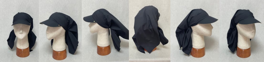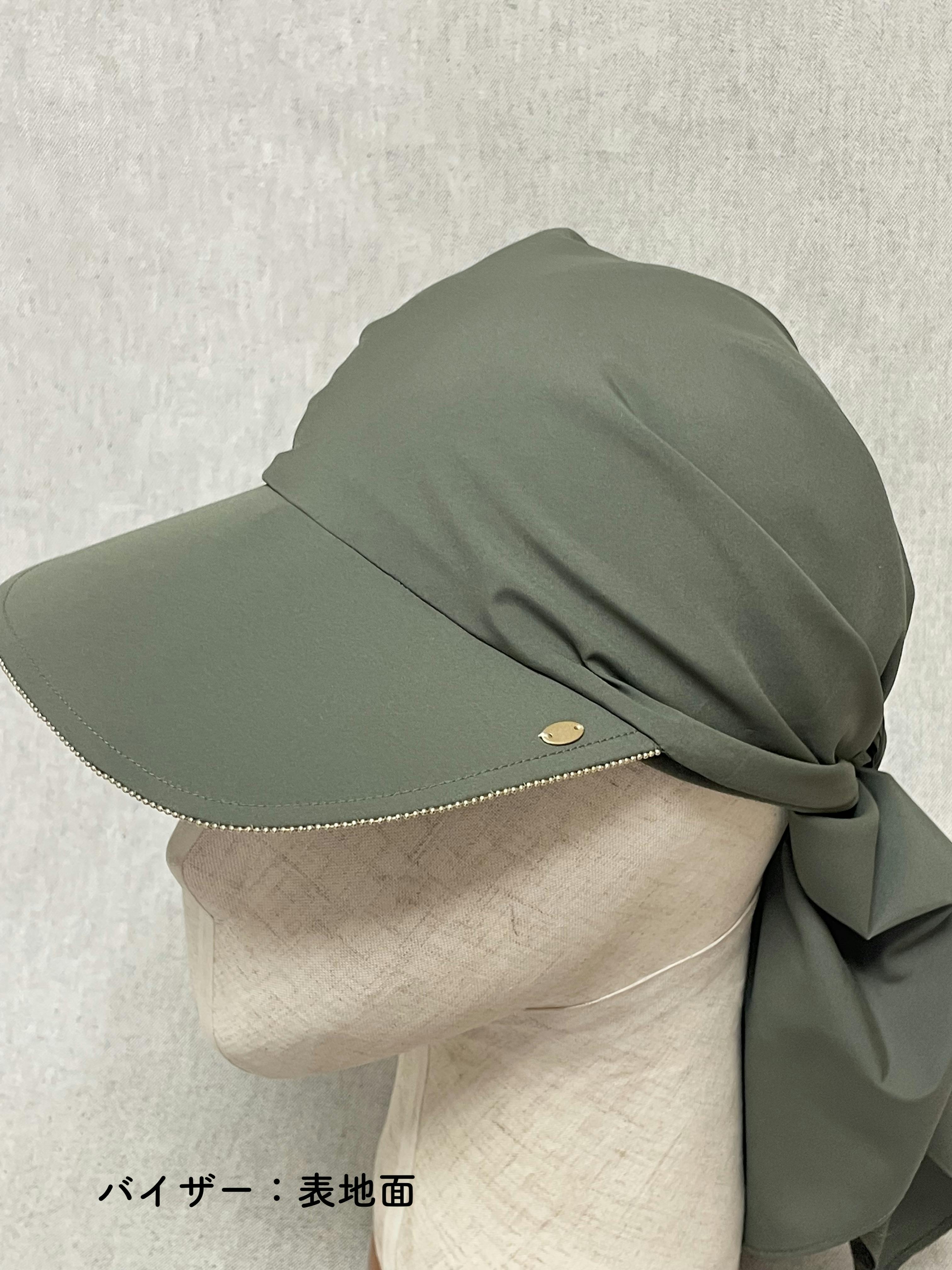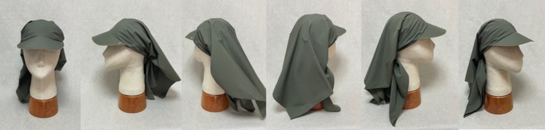 帽子本体のスカーフ部分には、撥水機能のあるマットタフタを採用しました。