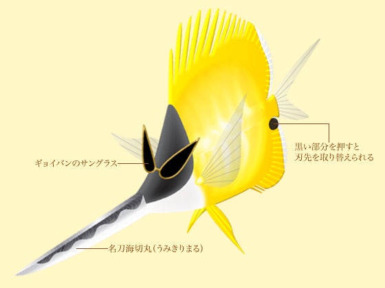 全長40cm。刃先20cm。ケーキカットの匠。動くスイーツフィッシュも奇麗に切り分ける。海中暴走族ギョギョギョの出身魚が多い。地方名きるやっこ、きる、ぎょさん。