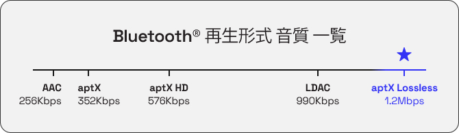 ロスレス・オーディオは、オリジナルのスタジオ録音からすべてのデータを保持します。これに対して、現在のBluetoothストリーミング技術では、伝送するためにオーディオデータ量を31%~56%圧縮する必要があるため、細部が失われ、視聴体験に悪影響を与えるアーティファクト(人的な加工)が付加されます。Qualcomm aptX™ Losslessでは、CD品質のロスレスオーディオ(16ビット/44.1kHz)が、レコーディングスタジオで録音されたものとまったく同じように、情報を失うことなく転送され、再生されます。