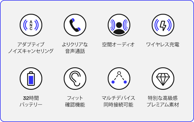 タッチコントロール - それぞれのイヤホンには、ユーザーがカスタマイズ設定可能なタッチセンサーが搭載されています。最大8つのタッチ入力(イヤホンごとに4つ)を割り当てることができ、スマートフォンに手を伸ばすことなく、完全に耳元からコントロールすることができます。
