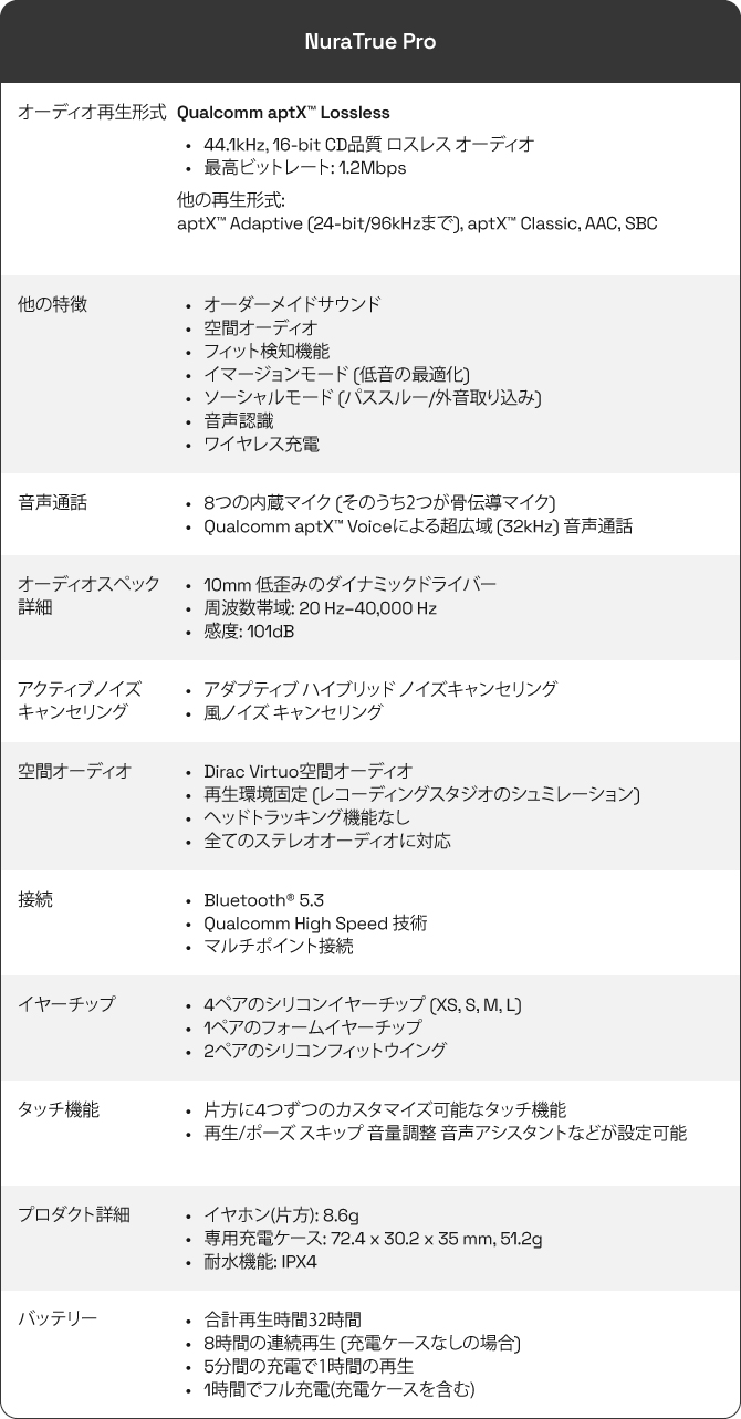 また、NuraTrue Proは、880Kbps(ロスレスの約80%の音質)の24ビット/96kHz lossy audioをサポートするなど、Qualcomm aptX™ Adaptive/Classicの以前のバージョンなどの下位音質への互換性も持っています。