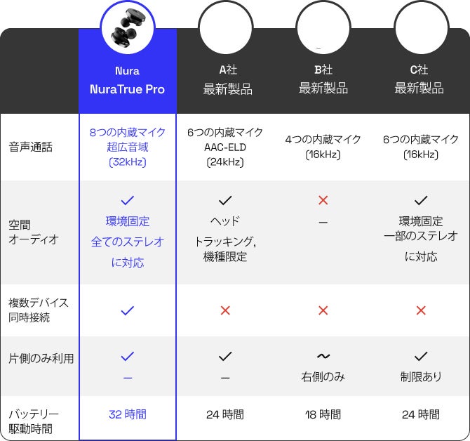 また、NuraTrue Proは、Qualcomm aptX™ Voiceを搭載し、標準的なBluetooth音声通話品質のサンプリングレートである16kHzの2倍の32kHzの超広帯域音声通話を実現しています。
