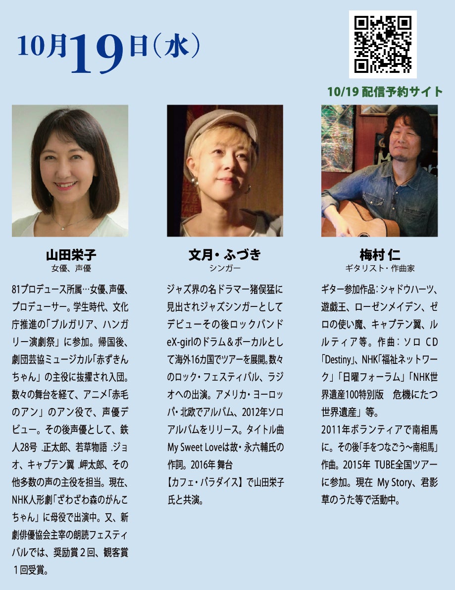 間もなく、声優の山田栄子さん、作曲・演奏家の梅村仁さん、シンガーの文月さんたちと初手合わせ。 田島久子さんの脚本を主軸に語りと音楽、歌… そして、山本が操演する人形たちが集う。独自の世界を紡ぎ出すインスピレーション、互いのインスパイアー。 5日間…5つのゲストとそれぞれの関わり方で不思議な舞台をご覧入れます。