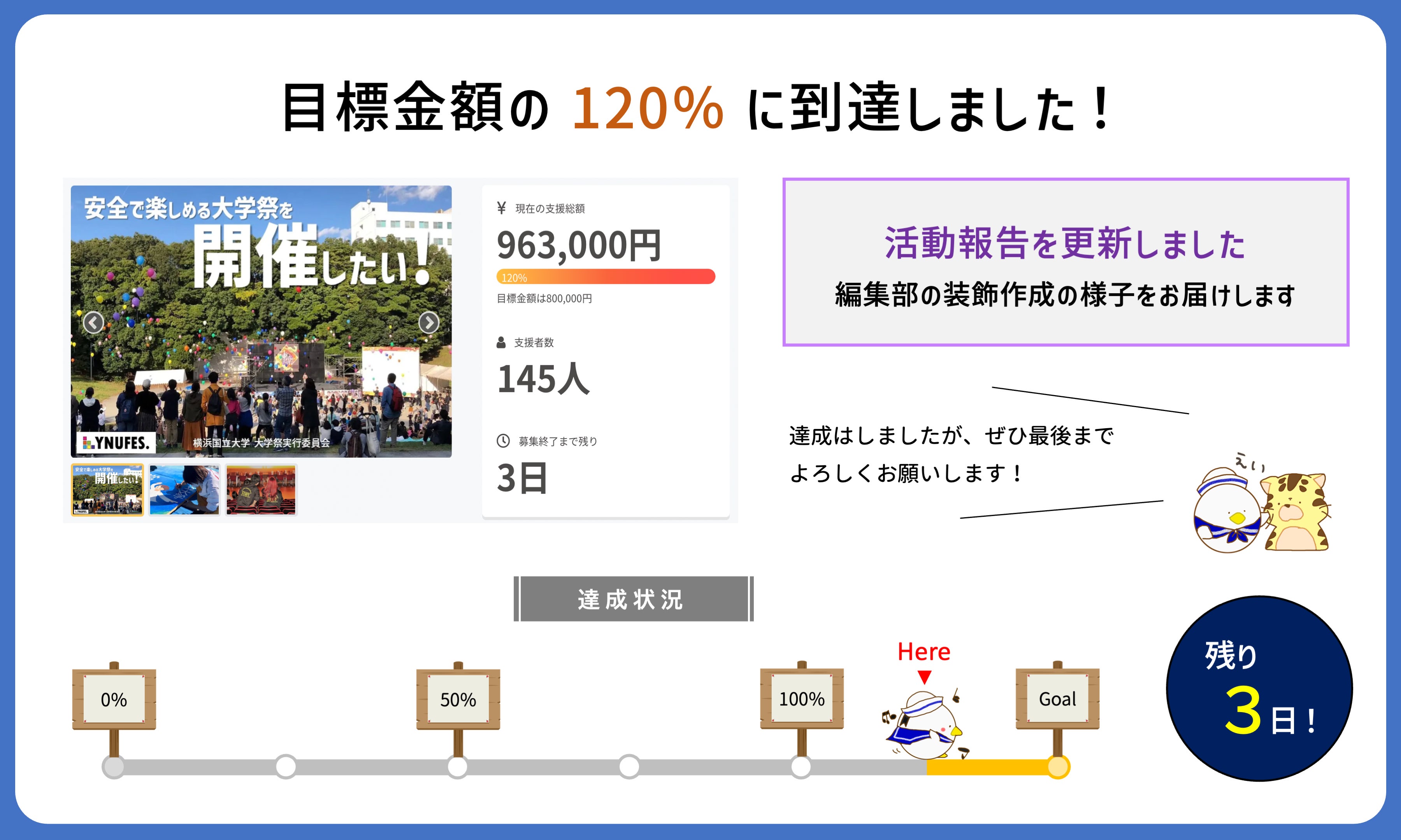 支援額が100万円を突破しました!今まで「万円」でのご報告はあまりにも生々しすぎるので「%」で統一していたのですが、さすがに3桁の大台に乗ることは想定外でした…。繰り返しにはなりますが、本当にありがとうございます…。私たちの望んでいた形での大学祭が開催できそうです! 本日の活動報告ですが、初登場経理部より現在の予算状況がクラファンでどう変わったかについて今思うところをお伝えしています。ぜひご覧ください。 こんにちは、経理部です!6部局の中での経理部の役割は、文字通り「お金のプロ」。各部局の予算作成から監査の運営まで、関係することを一手に引き受けています。 せっかくなので、予算を代々作ってきた身として、率直な感想を述べさせてください。予算検討を始めた当初、満足のいく対面大学祭が開催できるとは到底考えられませんでした。 それどころか、例年ご協賛を頂いている企業様からコロナ禍を理由に協賛をお断りをされるというケースが相次ぐ一方で、コロナ禍で来場者の安全を確保するため、削ることのできない支出が増加しており、満足のいく大学祭どころか、対面開催の実施が予算面で危ぶまれておりました。 実は2019年度の常盤祭以降の大学祭が中止となってから、実行委員会の予算は長期的に足りていませんでした。ここ数年の大学祭がオンライン開催でなかったら、もっと早い段階で限界を迎えていたと思います。各部局の長が集まる「長M」という会議があるのですが、そこで予算の話が議題に上がると、絶望から雰囲気がお通夜になる、というのもザラでした。 このような状況で、私たちはクラウドファンディングを始めました。というより、「始めざるをえませんでした」。他大学さんのクラファンの事例を参考にしつつ返礼品を決め、「50万も集まらないのではないか」などと言いながら強気に80万円という目標を設定し、頼むなんとか集まってくれと思っていたことは事実です。 しかしみなさまの温かいご支援により、予算面での壁を乗り越えることができました…!実施期間も20日強と短い中、予想もしなかったほどの多くの方々にご支援をいただき、感謝の気持ちでいっぱいです。心より感謝申し上げます。 今後、みなさまからの支援を最大限に活用すべく、経理部一同、予算面における大学祭運営を精一杯支えてまいります。引き続き、横浜国立大学22常盤祭を応援していただけますと幸いです。◆◇◆◇◆◇◆ クラファンも残り2日となりました。募集は【9/23(金)23:59】までです。最後までご協力いただけると嬉しいです!!