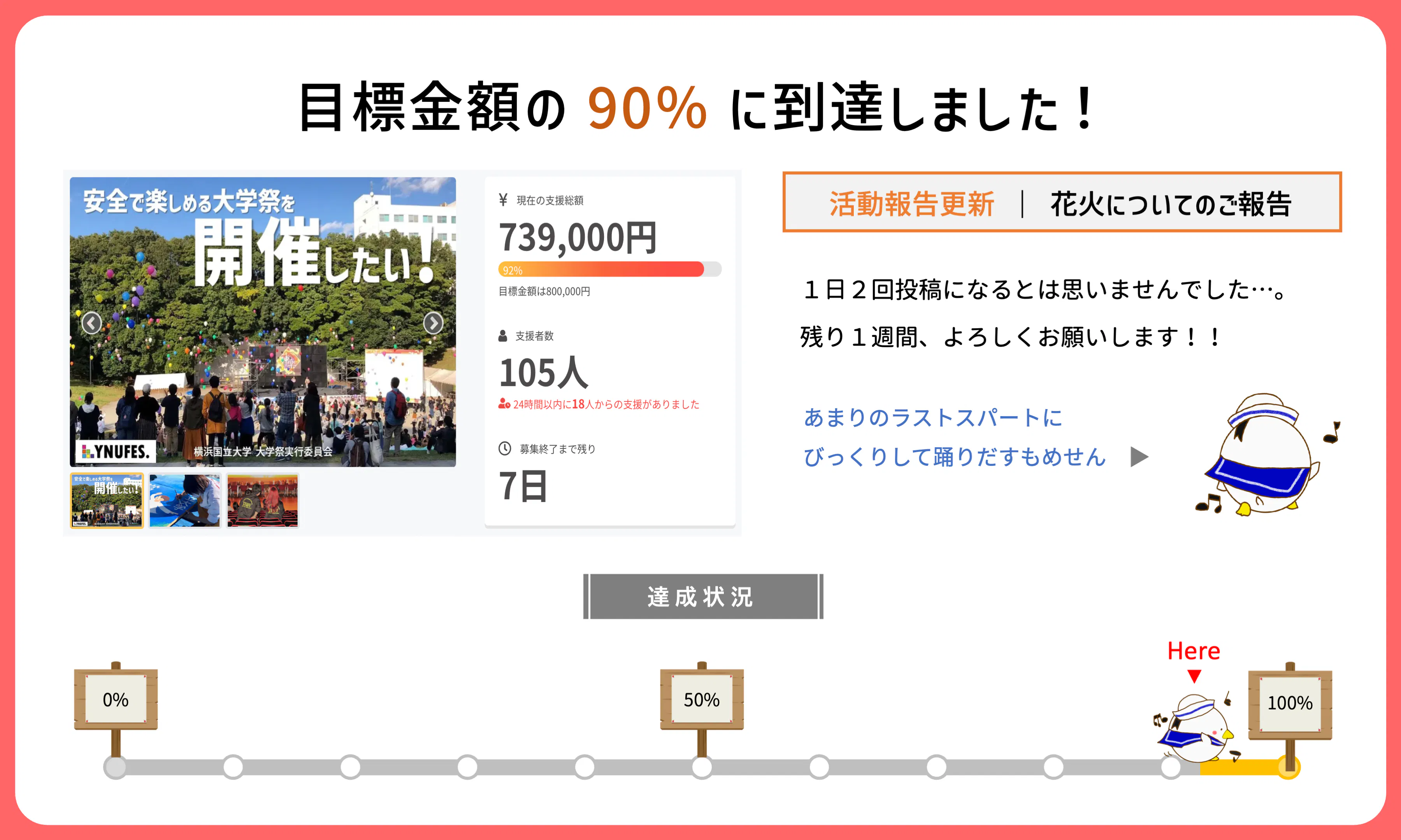 目標金額の90%に到達しました!今日の朝に80%のご報告をさせていただいたばかりですが、もう達成しました…。本当にありがとうございます!(この活動報告でメールの通知が増えてしまっているかもしれません、申し訳ございません)。