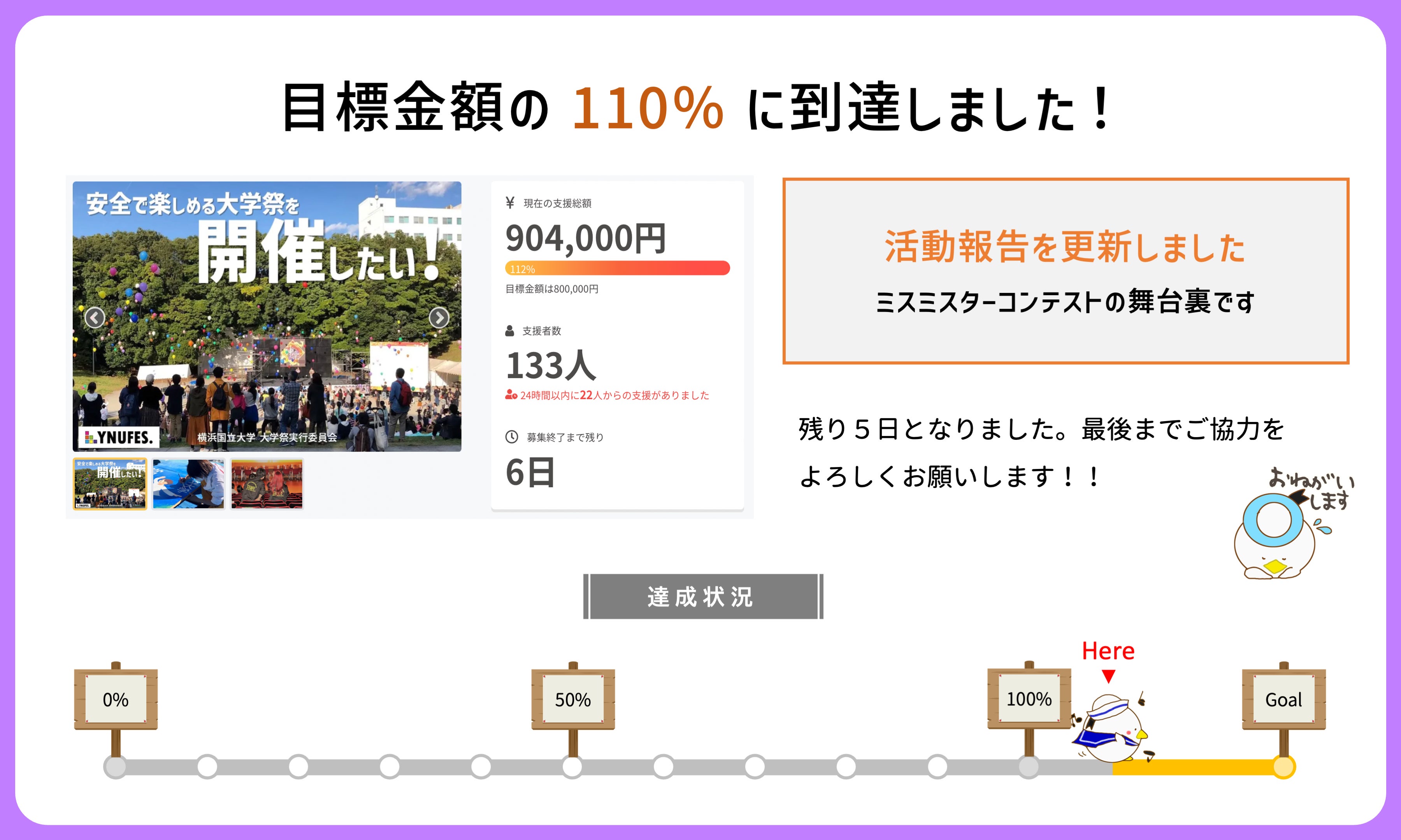 目標金額の110%を達成しました…!金額で言うと目標金額の80万円を10万円ほど上回っている状態です。感謝してもしきれません。毎度書いていることではありますが、本当にありがとうございます。