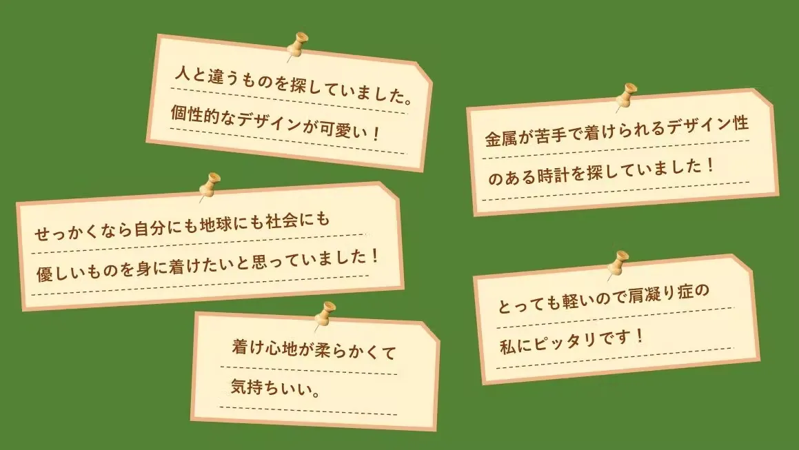 天然素材ならではの感想【軽い】【質感】【アレルギーでも使いやすい】や、NaetureWatchならではのユニークなデザイン性を気に入っていただけて、本当に嬉しいです。
