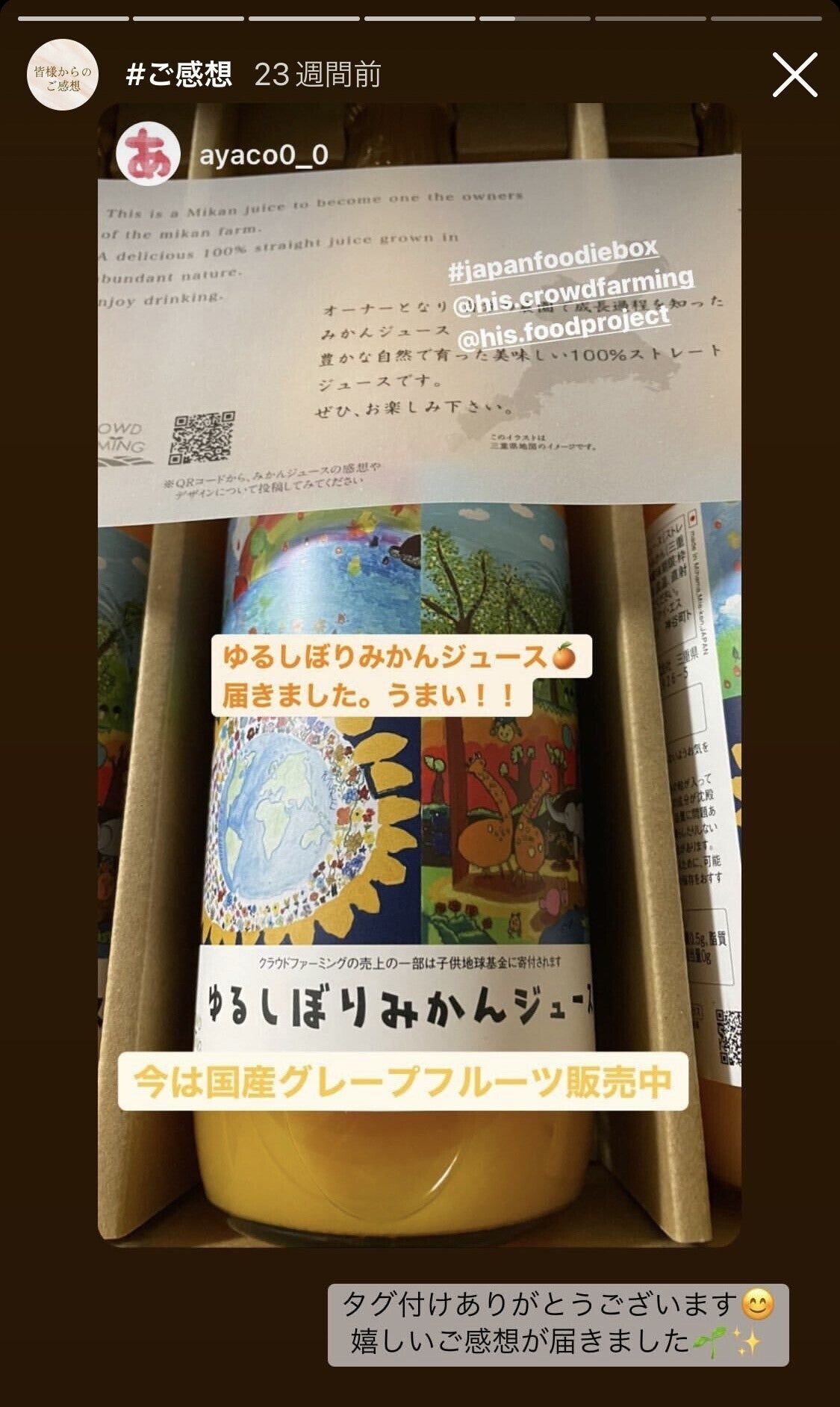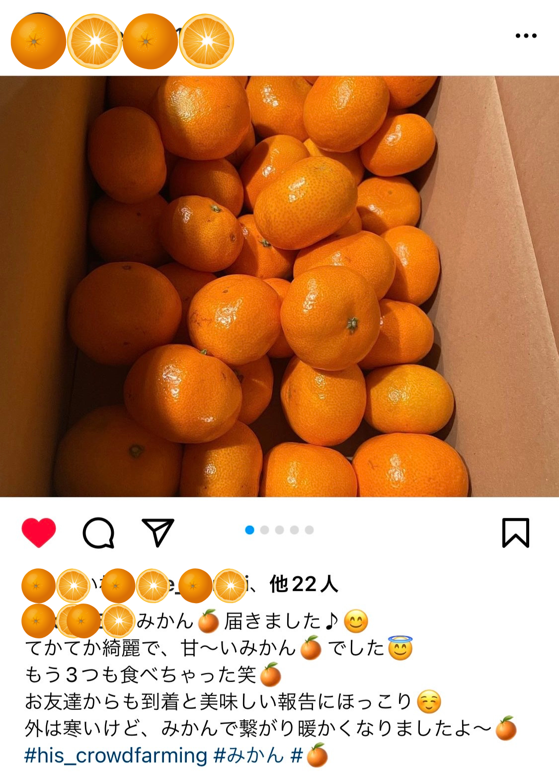 2022/11/28 16:19第4回 御浜町みかん成長レポート生産者の西さんより、収穫直前の11月末のみかんの様子が届きました。西さんから収穫直前のみかんの写真をいただきました。さらにみかん色が濃くなって輝いています。いよいよみかんの採果がスタートしました!皆様への発送は12月5日、6日頃を予定しています。みかんが届きましたらぜひ、感想や西さんへのメッセージなどをSNSなどでシェアしてください^^#his_crowdfarming のタグ付けもお待ちしております♪これから収穫したみかんを搾汁しジュースにしていきますので、ジュースをお申込みいただいた方へは1月の発送予定となります。もうしばらくお待ちくださいませ。 もっと見るVol.03 生産者西さんによるみかん成長レポート