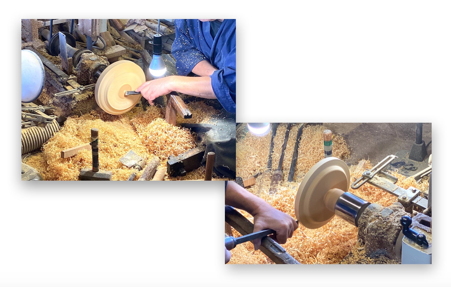 ご支援ありがとうございます。Ofukuwakeの木地挽きの様子を撮影させていただきました。動画など制作予定ですが、今回は写真2枚のみで失礼します。Ofukuwakeは材料の関係で早めに木地挽きに取りかかっていただけましたが、TsuzumiとMiyabiも当初の予定よりも早く木地が入手できたとの連絡をいただきましたので、乾燥を経て、木地挽きに取りかかっていただく時期も早くなりそうです。またご報告させていただきます。