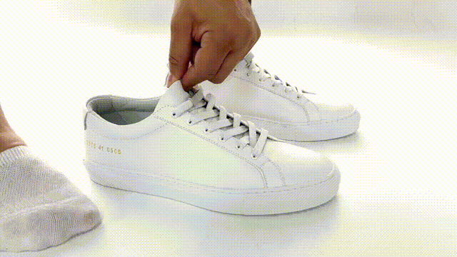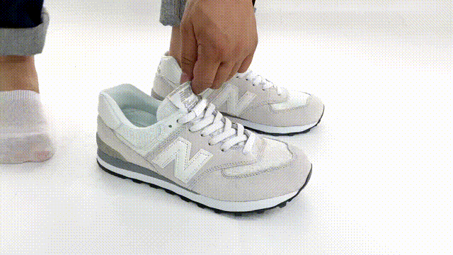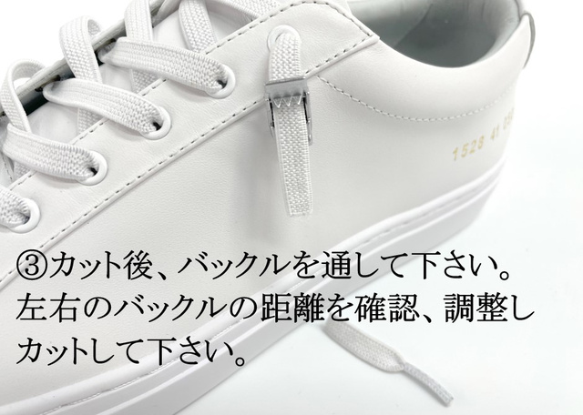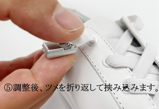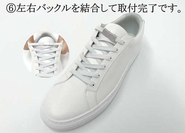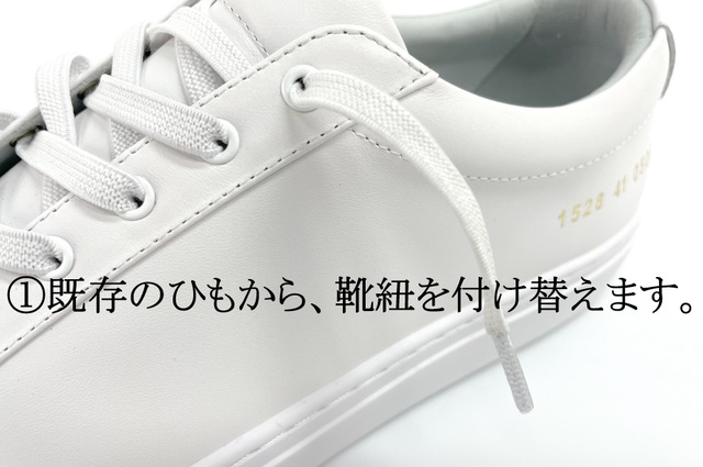 ご覧ください!靴のベロを持ち、かかとをスッ!と靴に滑り込ませ、パッ!とスッと履くことが出来ます!元々ついている既存の靴ひもから【ノットレス2】に変更して履いてます。英語でKNOTノットは結び目、LESSレスは無い意味です。ノットレスは結び目無しの意味です。この結ばない靴紐ノットレスは靴ひも結びの悩みから解放!