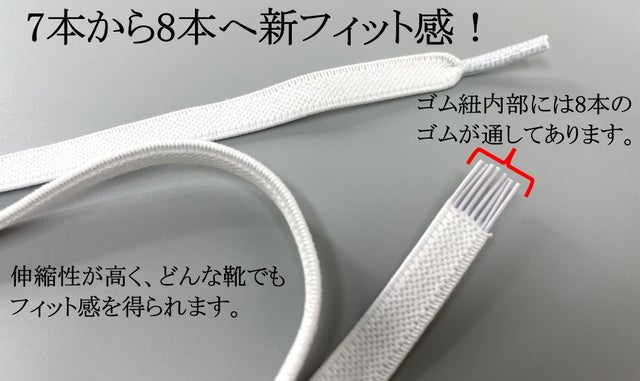 高いゴム紐です。中に特殊な細いゴム紐が8本通してあります。ノットレスでは7本を通しておりましたが、今回1本増やし更なるフィット感にこだわりました!