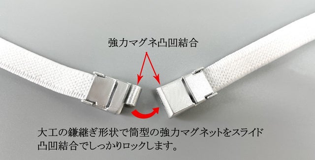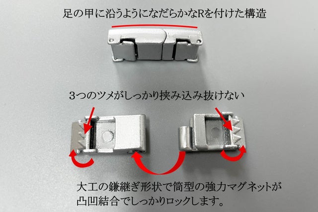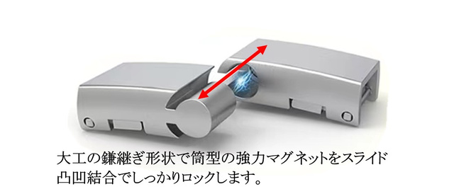 バックルを互い違いの凸凹形で合わせる、大工の鎌継ぎのような形状