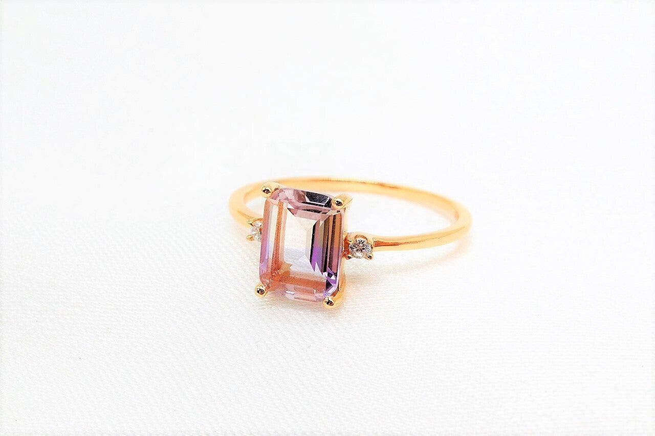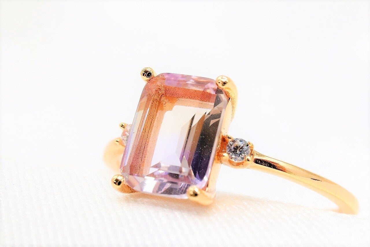 いま人気を博しているストーン「アメトリン」をメインストーンにし、デザイン性にこだわったジュエリーに仕上げております。リングのサイドストーンには、キュービックジルコニアをアクセントとして付けております。素材はSilver925(18KGP)を使用しておりますので、くすみや変色しづらく、長くご使用いただけます。
