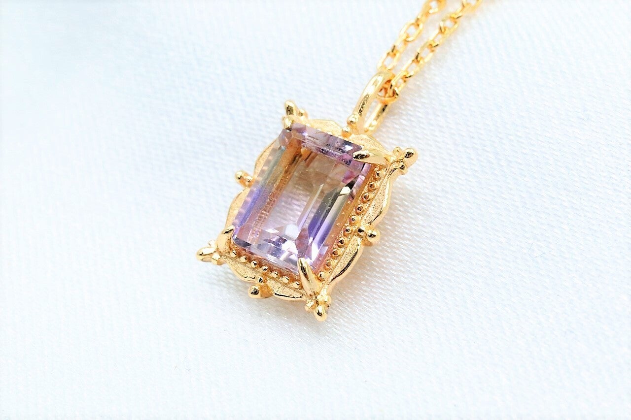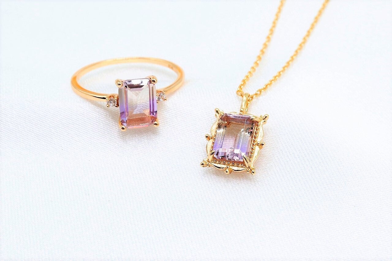 いま人気のストーン「アメトリン」を使用し、可愛らしいデザインに仕上げております。今回は「リング」「ネックレス」の2種類をご用意しております。お得な2点セット割がオススメです!!
