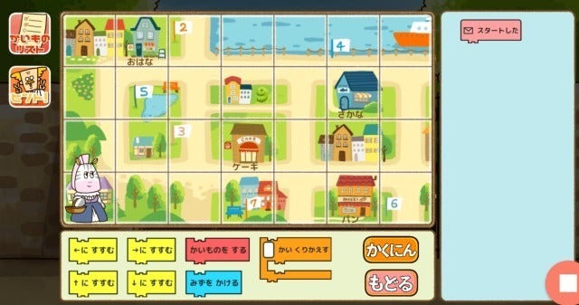 ミニゲームでは、数字を見ると寝ちゃうロジマちゃんが買い物に行くにはどうしたらいいのかを順序だてて考えながらプログラミングしていきます。