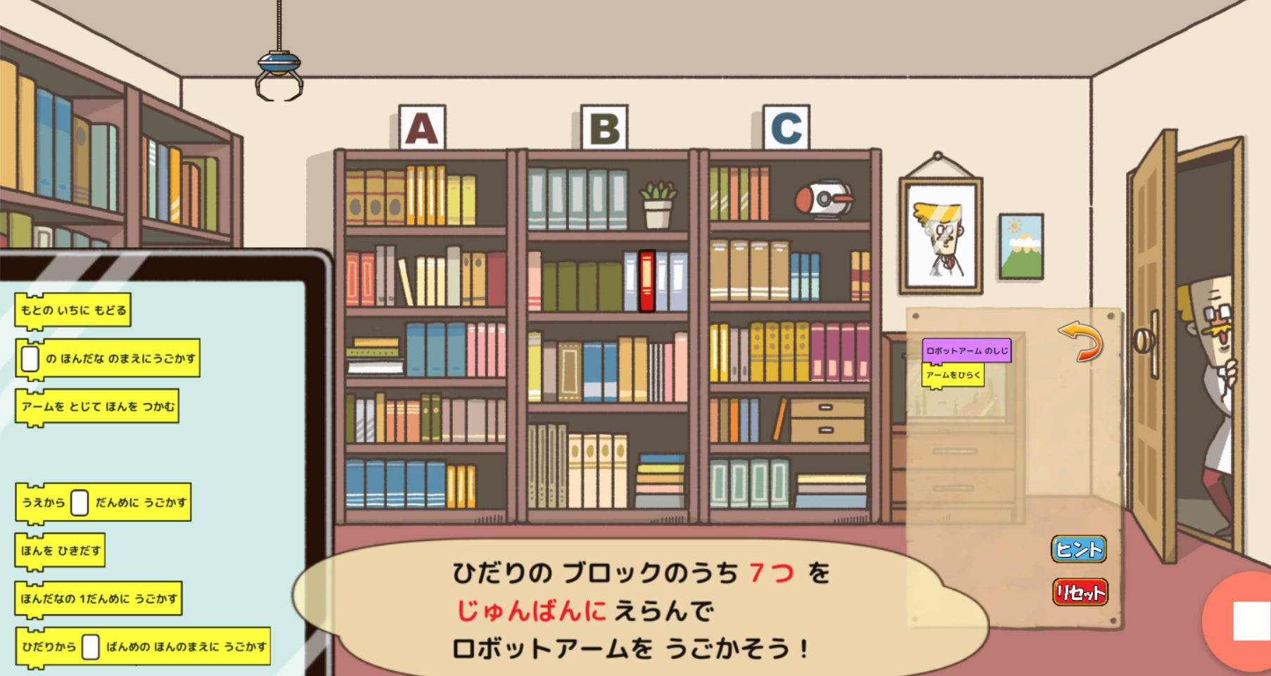 こちらは、秘宝ロゴスについての情報が載っている赤い本を、左上にあるロボットアームを動かしてとるためのプログラムを考えていきます。