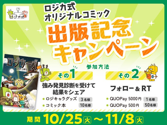 皆様,こんばんは!本日よりロジカ式公式Twitter上で,オリジナルコミック出版記念キャンペーンを開催しています☆https://twitter.com/logica_shiki参加方法は公式アカウントをフォロー後,TOPに固定されているキャンペーンツイートをリツイートするだけ♪なんと... QUOPay 5,000円と500円が,抽選で 51名様に当たります!ぜひ奮ってご参加ください(*'ω'*)