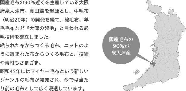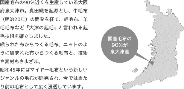 毛布は納入された糸が完成品の毛布になるまでの緻密で繊細な工程のすべてをひとつの工場で完結できる、毛布のまち泉大津でもただひとつの一貫工場、森弥毛織株式会社で作られています。