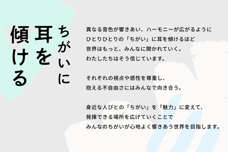 まずは、『ちがい』というものをフラットに知ることや、互いを認め合えるコミュニティや社会をつくっていくことが、自分や周りの人の魅力に気づいたり、自分のよさや強みを発揮していったりすることに繋がると考えているのです。