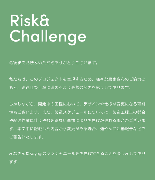 2023/04/30 21:00こんばんは。soyogiの後田です。2月末より着手しておりました、発送に区切りが付きました。当初の予定より、大変お待たせしてしまい申し訳ありません。住所の誤りや、ご不在などの兼ね合いで、一部お届けが完了できていないものもあります。こちらからも順次お問い合わせのご連絡をさせていただいておりますが、もしまだ届いていない方は、CAMPFIREのメールにてご連絡いただけると嬉しいです。発送開始した2月から、みなさまの投稿を見て、チーム一同嬉しく思っています。商品の感想から、楽しみ方、空き瓶の活用のアイデアまで、ひとつひとつのコメントが嬉しく、励みになっています。また、今回の結果を受けて、一般販売に向けて挑戦することを決めました。今回、みなさまから頂いたご意見をもとに、今後の商品開発に取り組んでいきたいなと思います。引き続き soyogiの応援よろしくお願いします!【各種SNS】[Twitter]soyogi公式 Twitter[Instagram]soyogi公式Instagramsoyogi 後田 もっと見る