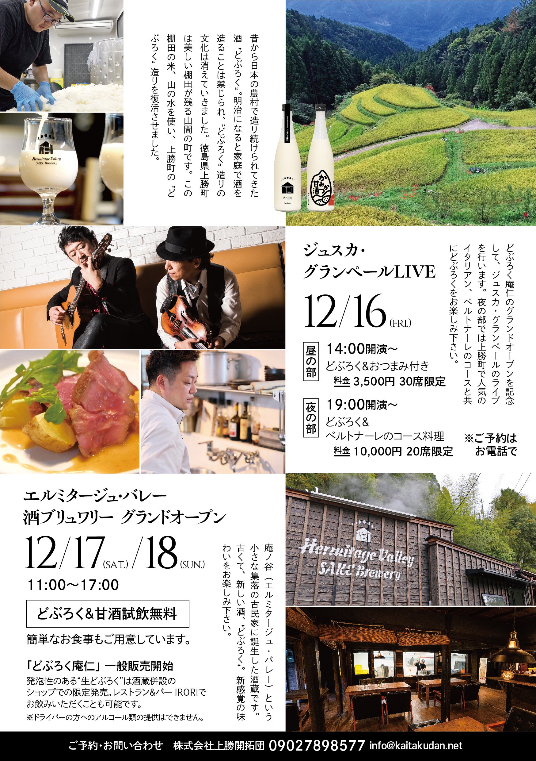 夜の部では上勝町で人気のイタリアンレストラン、ペルトナーレの表原平シェフがコース料理を作ってくれることになりました。どぶろくとイタリアンのペアリング、そしてジュスカ・グランペールの音楽を山奥の古民家バーでお楽しみ下さい。