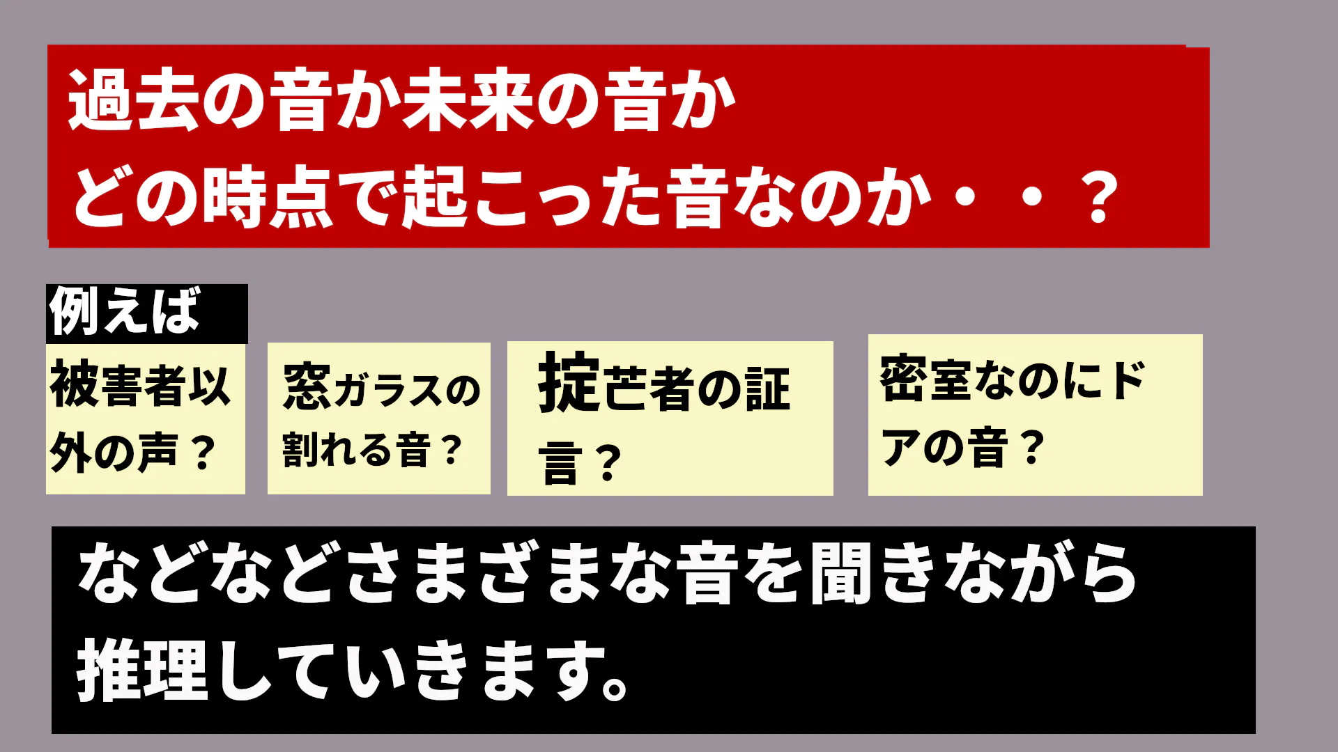 過去や未来に発生したさまざまな音や場面を見たり聞いたりなどをして実際に何が起きたのか推理していきましょう!