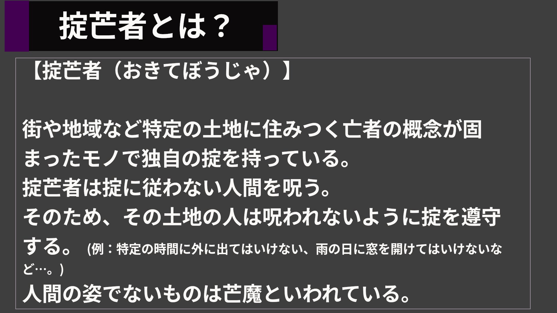 用語 掟芒者とは掟を守らせる亡者のこと。本作の推理パートの重要な用語です。