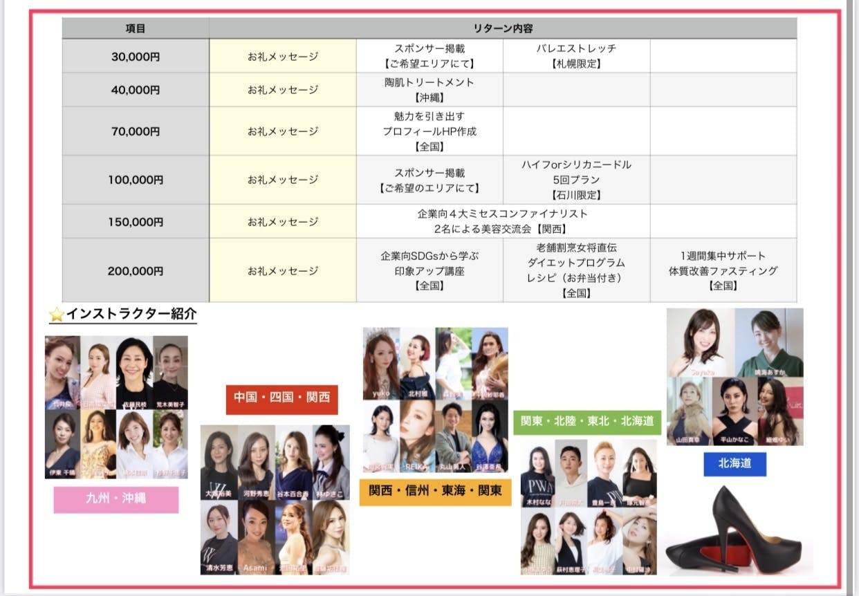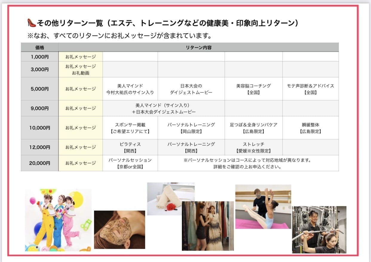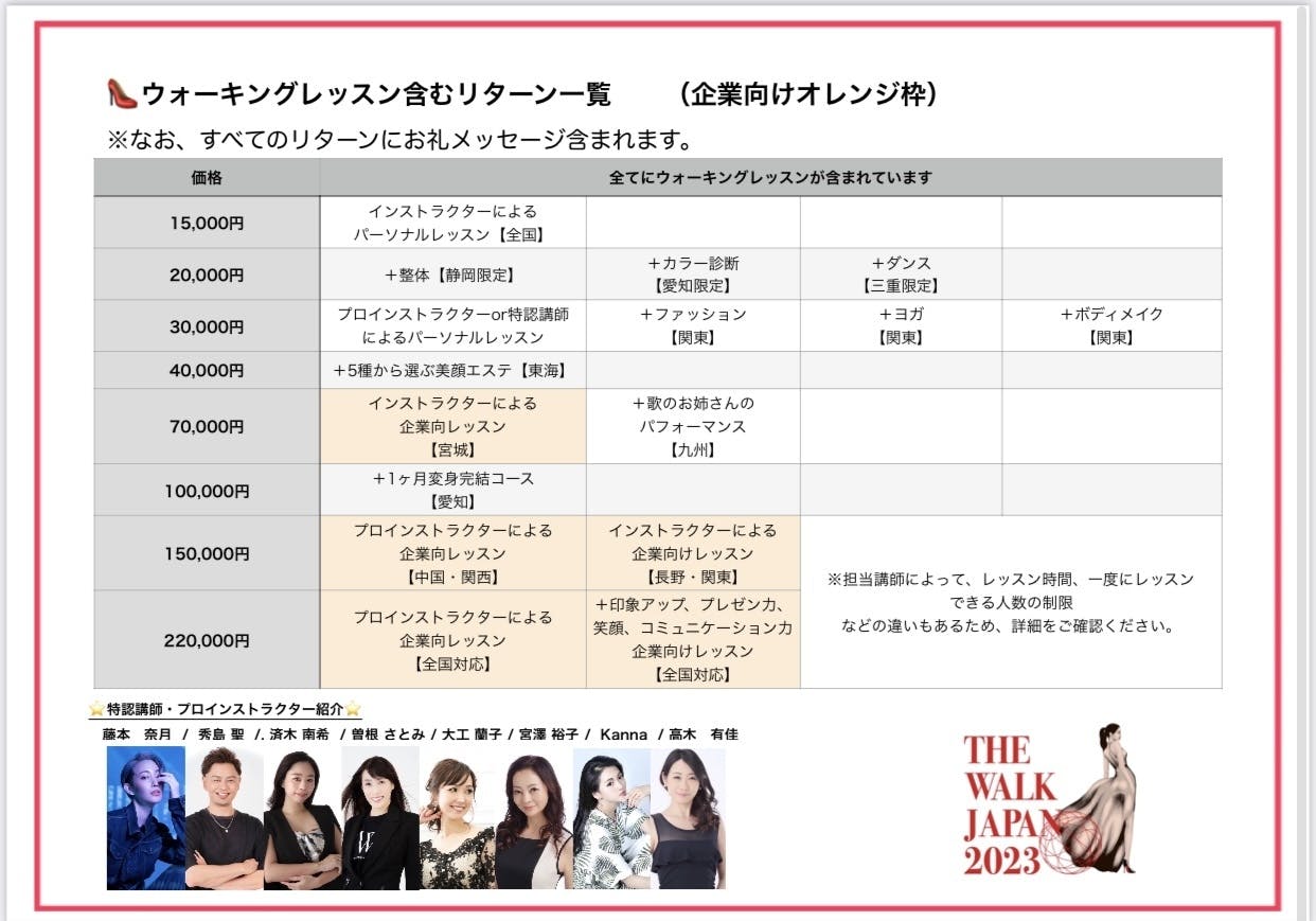 ウォーキングレッスンや個々の特技、資格を活かしたリターンを多数ご用意しております。