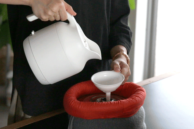 取っ手付きの蓋なので、熱湯を注ぐ本体に直接触れずに開閉したり、持ち運びも便利です。