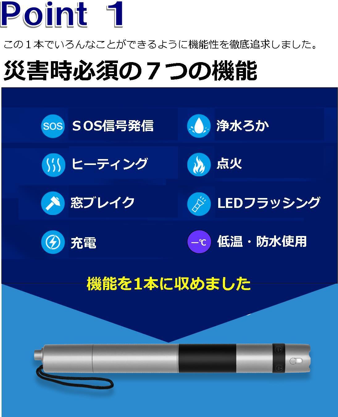 「SOS・水・暖・火・砕く・灯り・電気」の緊急時必須7機能が内蔵されたハイスペックな1本です