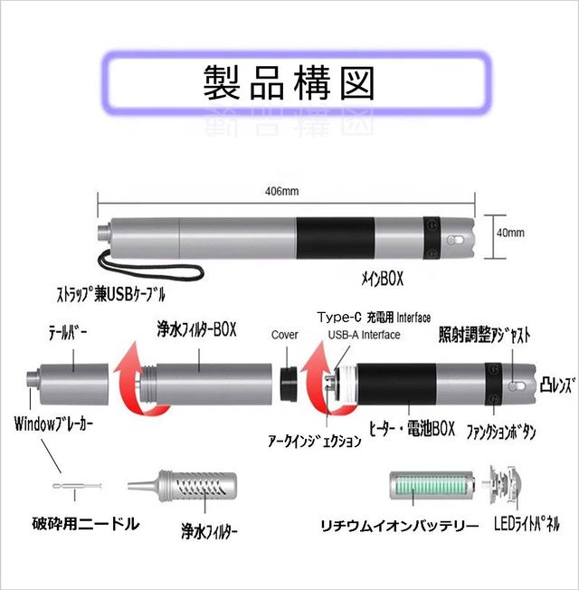 この機能は、ロッドを3分割して、上図のように、エレメントカップの吸引側を口に、開口側を川や湧き水などに直接入れて、ストローのように吸引します。または、流れ出る自然水をロッドに注水し吸水します。