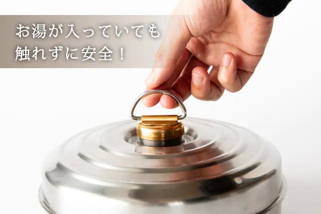 取っ手付きの蓋なので、熱湯を注ぐ本体に直接触れずに開閉したり、持ち運びも便利です。