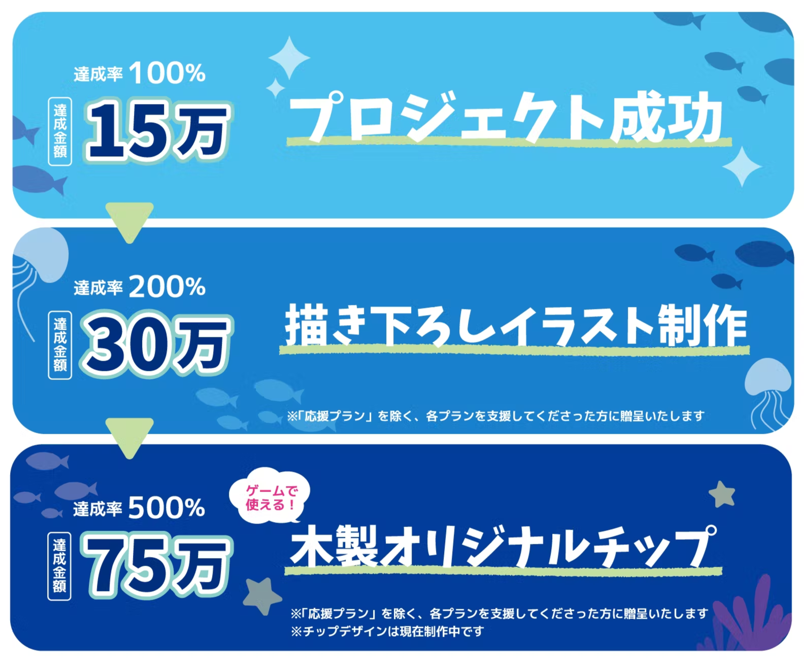 こんにちは、月島ファクトリーです!日々、たくさんのご支援ありがとうございます!皆様のご支援を受けまして、この度、新たにストレッチゴールを設定することにいたしました!さらに!リターン品の追加もいたしました。既にご支援いただいている方にも、ご支援を悩んでくださっている方にも是非お勧めしたいプランをご用意しております!【追加リターン品】・アクスタセットプラン・アクスタプランA・アクスタプランB・アクスタプランCストレッチゴールと追加リターン品の詳細はぜひプロジェクトページにてご確認ください!引き続き「ぼくらのうみ」をどうぞよろしくお願いいたします!