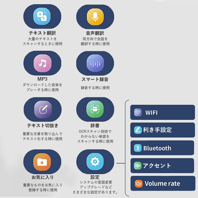T-PEN PRO 3.0は、プロ仕様のペン型翻訳機です。112の言語の翻訳に対応しており、紙面や画面を問わずどこからでも文字をスキャンできる上、リアルタイムでの双方向音声翻訳にも対応しています。また、オフラインモードにも対応しているため、インターネットが使えない場所でもご使用いただけます。スマートなMP3録音機能も備えており、重要な会議を丸ごと録音可能。T-PEN PRO 3.0で、世界中の人々との言葉の壁を乗り越えましょう!
