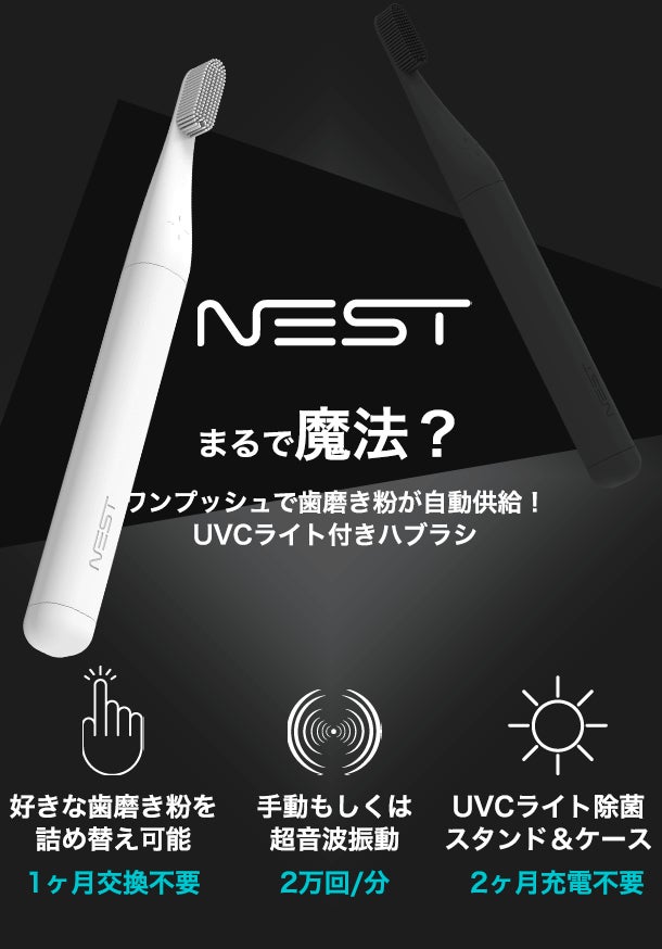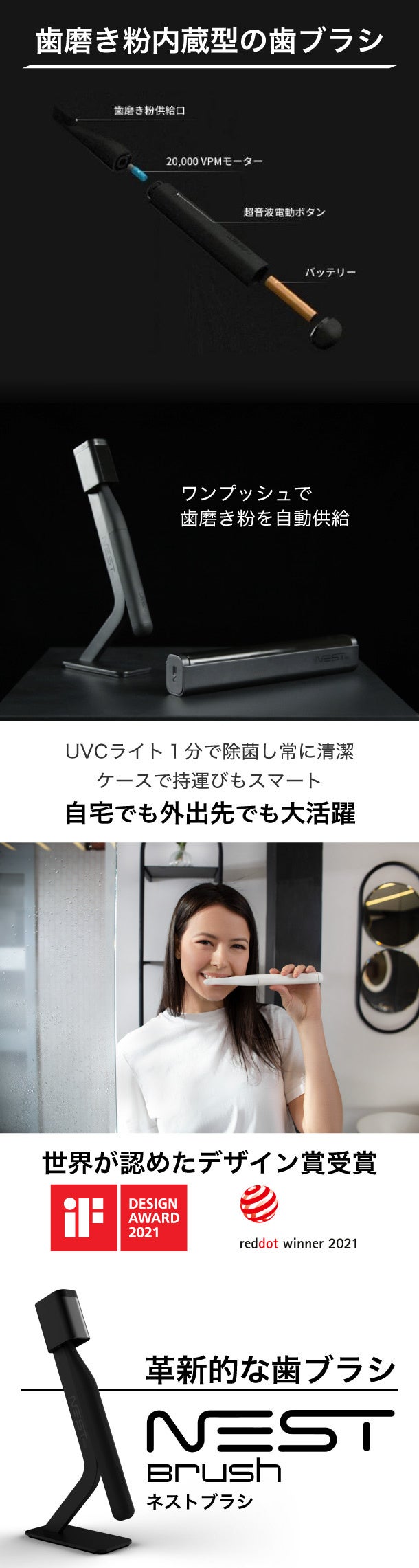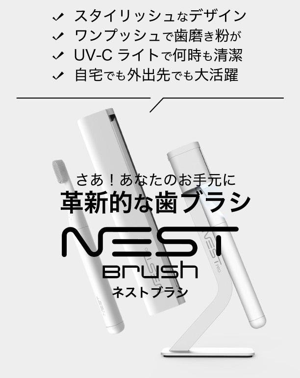 A:Nest Brushは、革新的な歯磨き粉自動供給機能により、付加価値を生み出しているからです。スタイリッシュなデザインと、衛生面での機能が見事に調和しています。