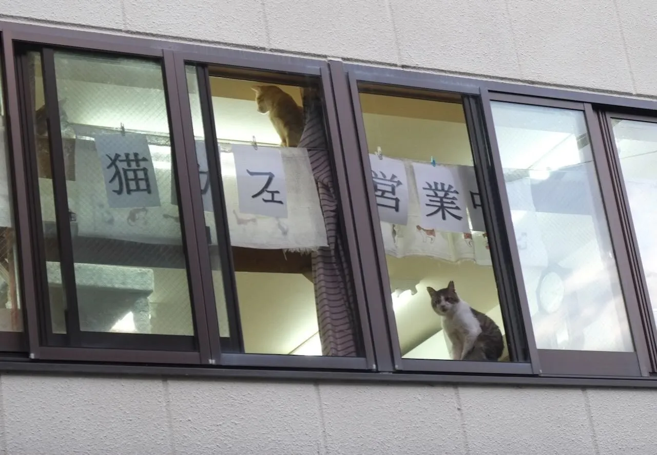 『ラブとハッピー』は京王線南平駅のすぐそばにあり、春には猫さんたちがウインドーからお花見をしながら、ゆったりと過ごしています。