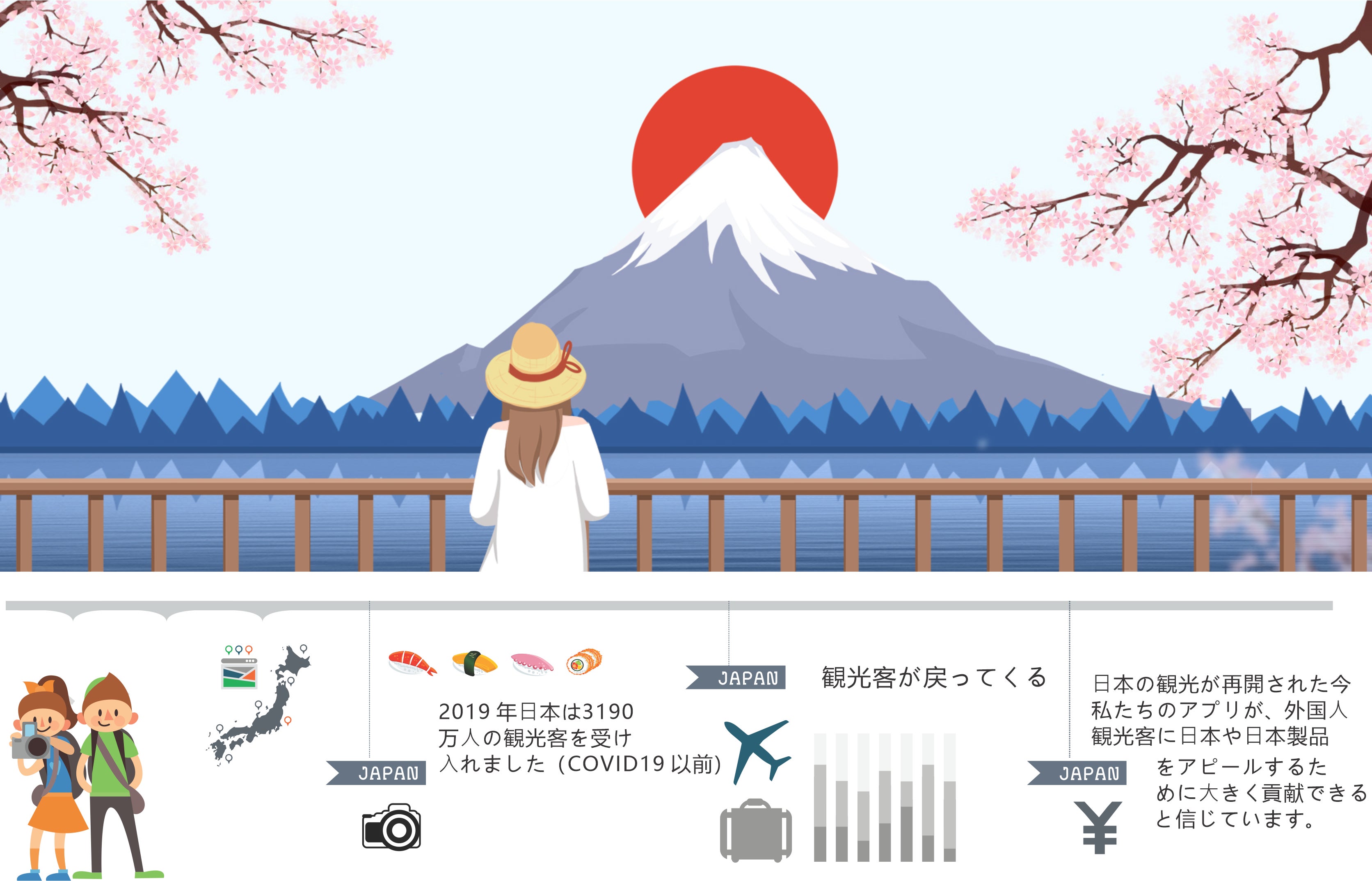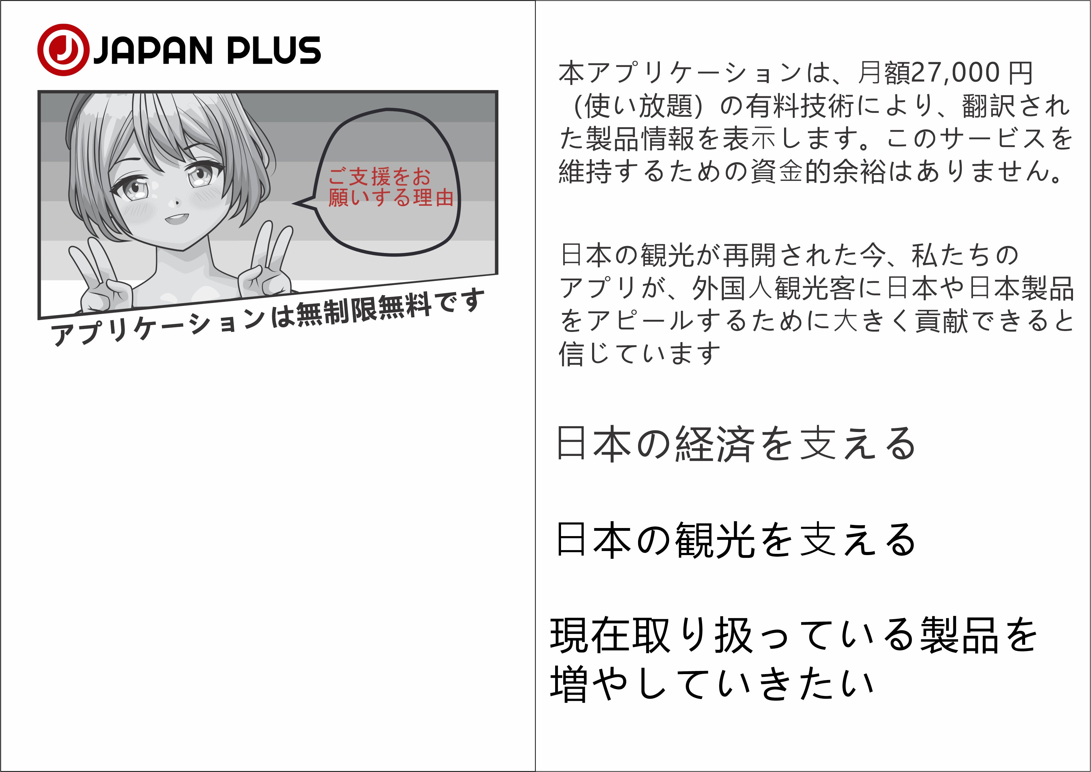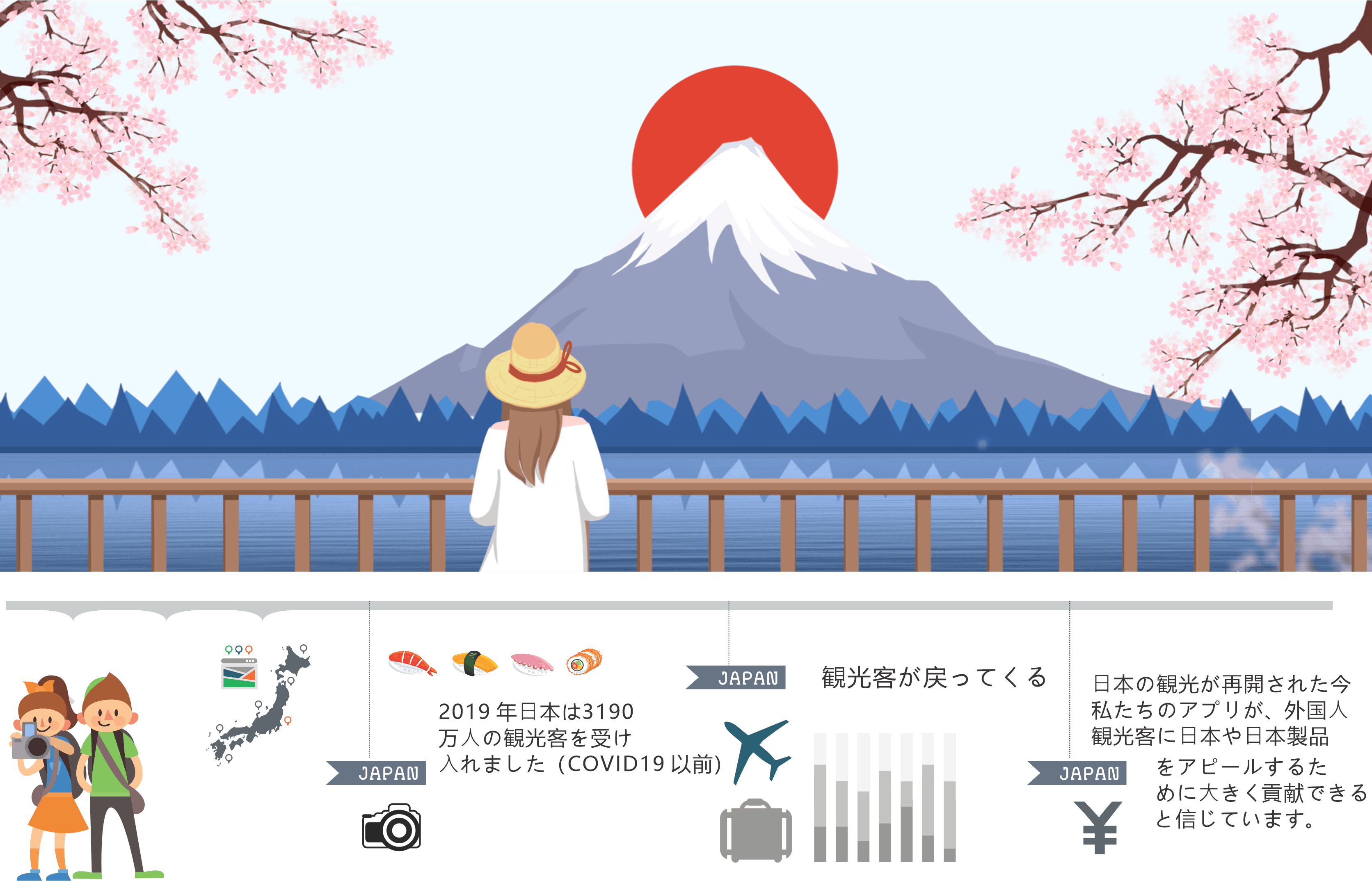 * 2019 年、⽇本は 3190 万⼈の観光客を受け⼊れました(COVID19 以前)。この数 は、国境が再び開かれるにつれて増えていくでしょう。⽇本語が読めない観光客 は、⽇本の素晴らしい製品を楽しむ貴重な機会を逸してしまうのです。