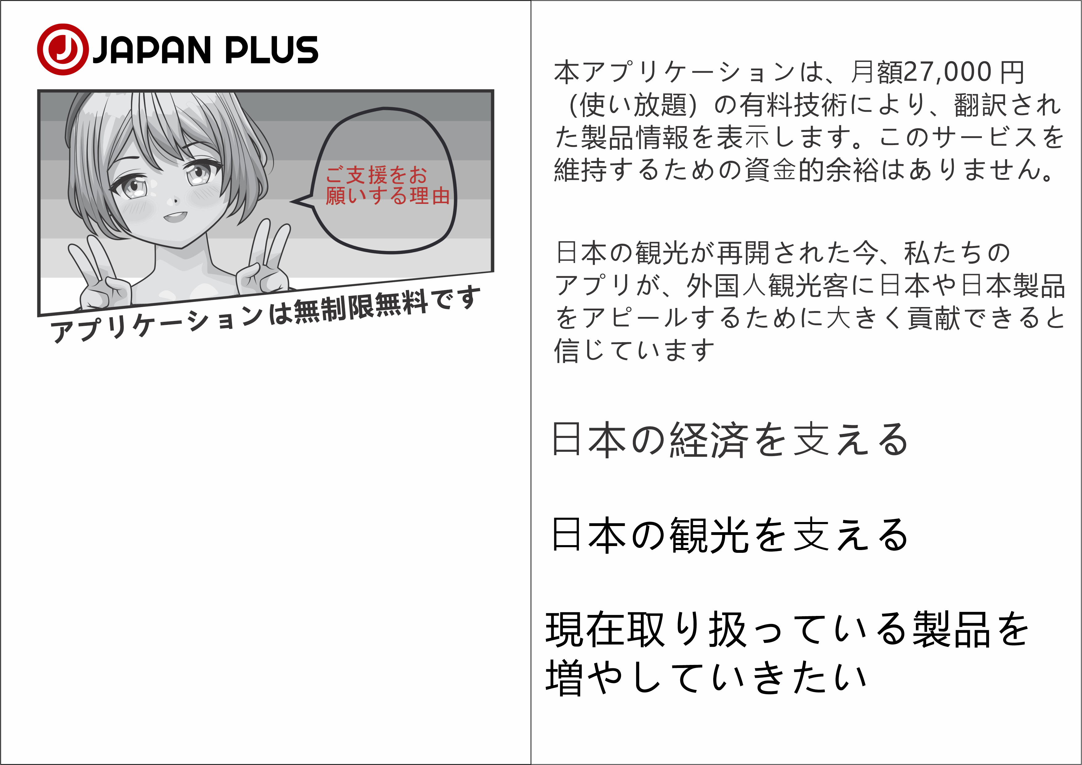 * ⻑年にわたり、観光客や外国⼈居住者との会話の中で、⾔葉が読めないために⽇ 本の商品を理解して購⼊するのに苦労することがよくありました。 ⽇本は、すべての⼈々の好奇⼼をかき⽴てる驚くべきユニークな国であり、⽇本の 製品は世界中でよく知られており、優れた評価を得ています。 観光客が⽇本で素晴らしい体験をし、⽇本製品を知り、試すことができれば、その 満⾜度は⾼まり、より多くの消費をすることができ、経済にも貢献し、⽇本や⽇本 製品の素晴らしさを世界中に広めることができるのです。 もう 1 つの重要な要因は、⽇本に居住する外国⼈の数です (2022 年には 2,823,565 ⼈ です)。これらの外国⼈居住者は毎⽇お⾦を使い、代替品を探す代わりに⽇本の製品 に⽬を向ければ、経済を⼤きく後押しすることができます。