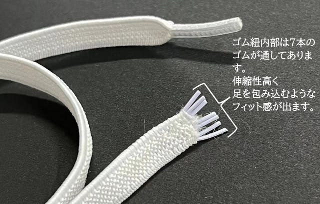 7本特殊ゴムがひもに通ってますので、伸ばして広げて履いても、元に戻ります。更に足に沿ってゴム紐のテンションがかかりますので、ピタッとフィットします。