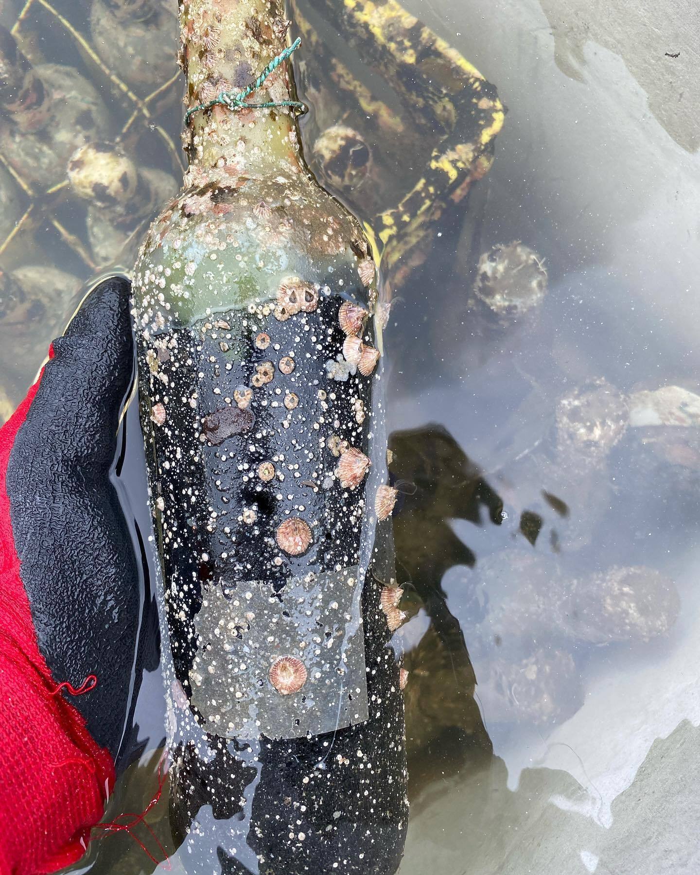 小網代湾の豊かな自然で完成された海底熟成オーガニックワインのボトルには、芸術的で神秘的な貝類が付着します。