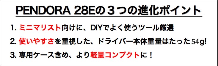 PENDORA 28Eは、よりコンパクトでより多機能な商品を届けたいという思いで開発しました。全て箱の中に収納ができ、軽いのでカバンに入れて持ち歩いてもあまり重さを感じないように設計しております。ぜひ、お手に取って作業の快適さを体感してください。