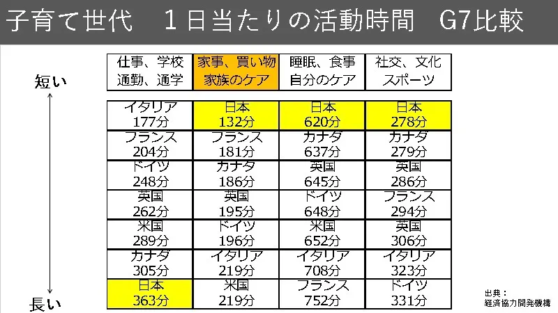 主要7か国の子育て世代の活動時間を比較すると日本がダントツに労働時間がながく、家事・家族のケアする時間が短いです。