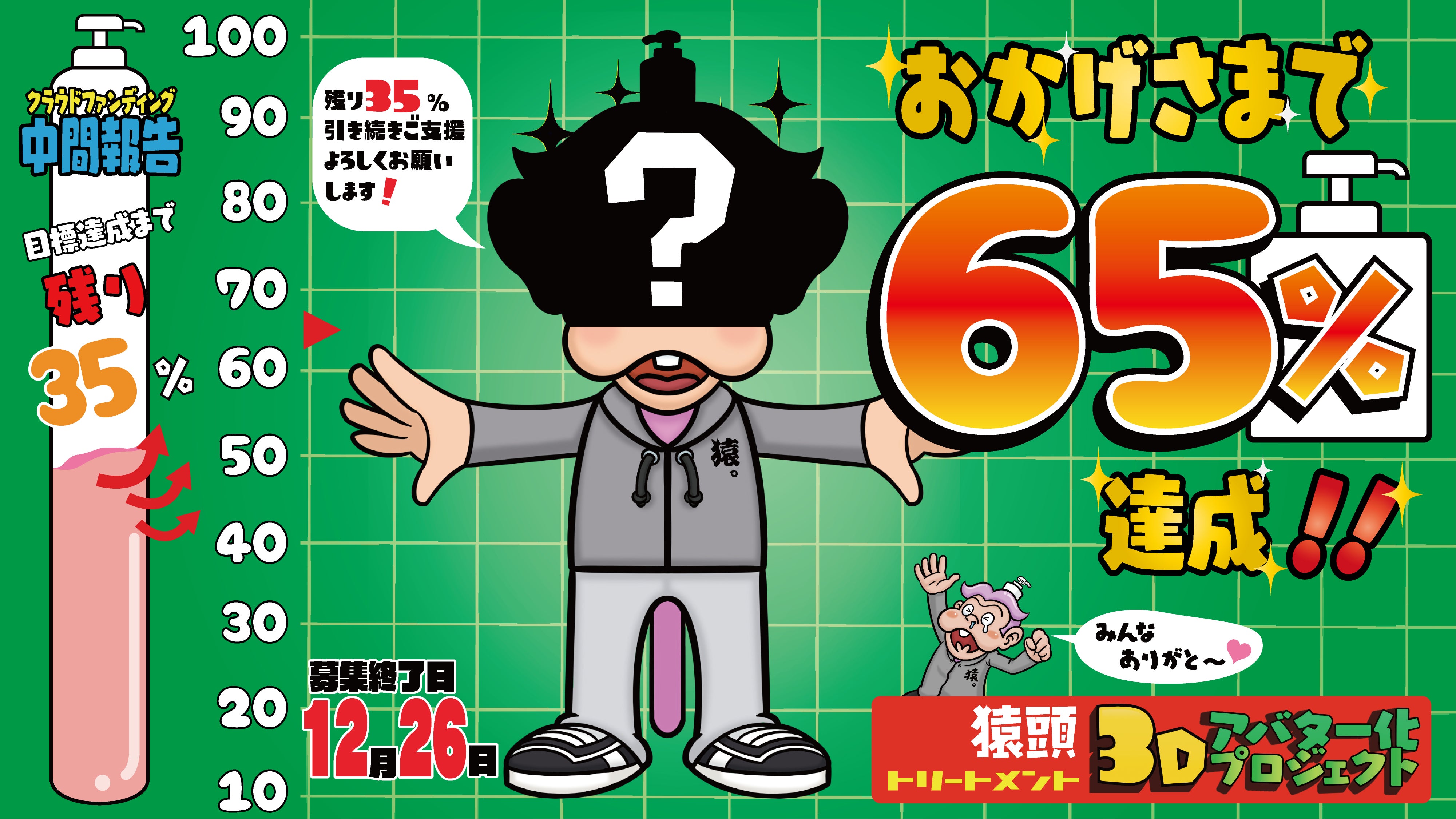 こんにちは、こんばんは!猿頭トリートメントです!猿頭3Dアバター化プロジェクト終了まで後 11日となりました。お陰様で現在・・・・なんと85%を達成できております!何とかこのまま100%突破したい・・・皆さん、拡散など応援よろしくお願いします~!