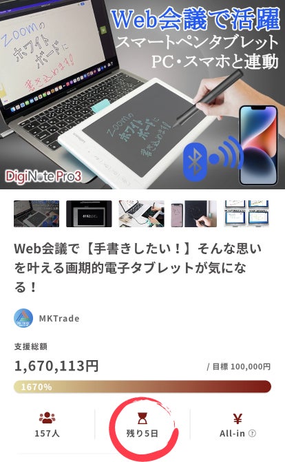 お世話になっております。MKトレードです。画期的電子タブレット『DigiNote Pro3(デジノートプロ3)』は、残すところあと5日になりました。大好評いただいており、誠にありがとうございます!!並びに多くのリピーター様にご支援いただき重ねてお礼申し上げます。Web会議中「手書き」で説明したい時、ありますよね?そんな時に便利なタブレット!★パソコン接続し「オンライン会議」でのホワイトボードにも対応!★『手書き』が出来る様々なオフィス系・ドロー系ソフトに対応。★専用スマホアプリで「同時描画」も可能! 自由自在に作品を描けてワクワクします!新感覚の「ペンタブレット」『DigiNote Pro3』https://camp-fire.jp/projects/view/655541お得なリターンも残りわずかとなっております。ぜひお早めにご検討いただけますと大変ありがたいです。この商品をもっと多くに方々に知っていただきたいと思っておりますので、SNSなどでのシェアなど大歓迎です!最後まで、どうぞよろしくお願いいたします。https://camp-fire.jp/projects/view/655541『DigiNote Pro3』プロジェクトスタッフ一同*************************************************************【同時開催中】★秘密のツバメノート『T-Note Secret』★新色登場!指紋ロックで秘密を守れるシステム手帳!https://camp-fire.jp/projects/view/655271★追加購入やクラファン商品がお得に購入できる「MKTrade限定ショップ」もぜひご覧ください♪https://mktrade2.official.ec/