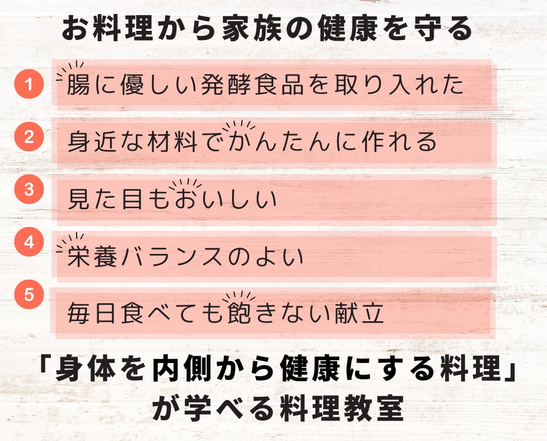 腸内環境を整えて体の内側から輝けるよう、麹など発酵食品を使ったメニューを料理教室で提案しています。