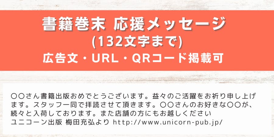 書籍の巻末に、みなさんの応援メッセージを掲載します。88文字・110文字・132文字からお選びいただけます。