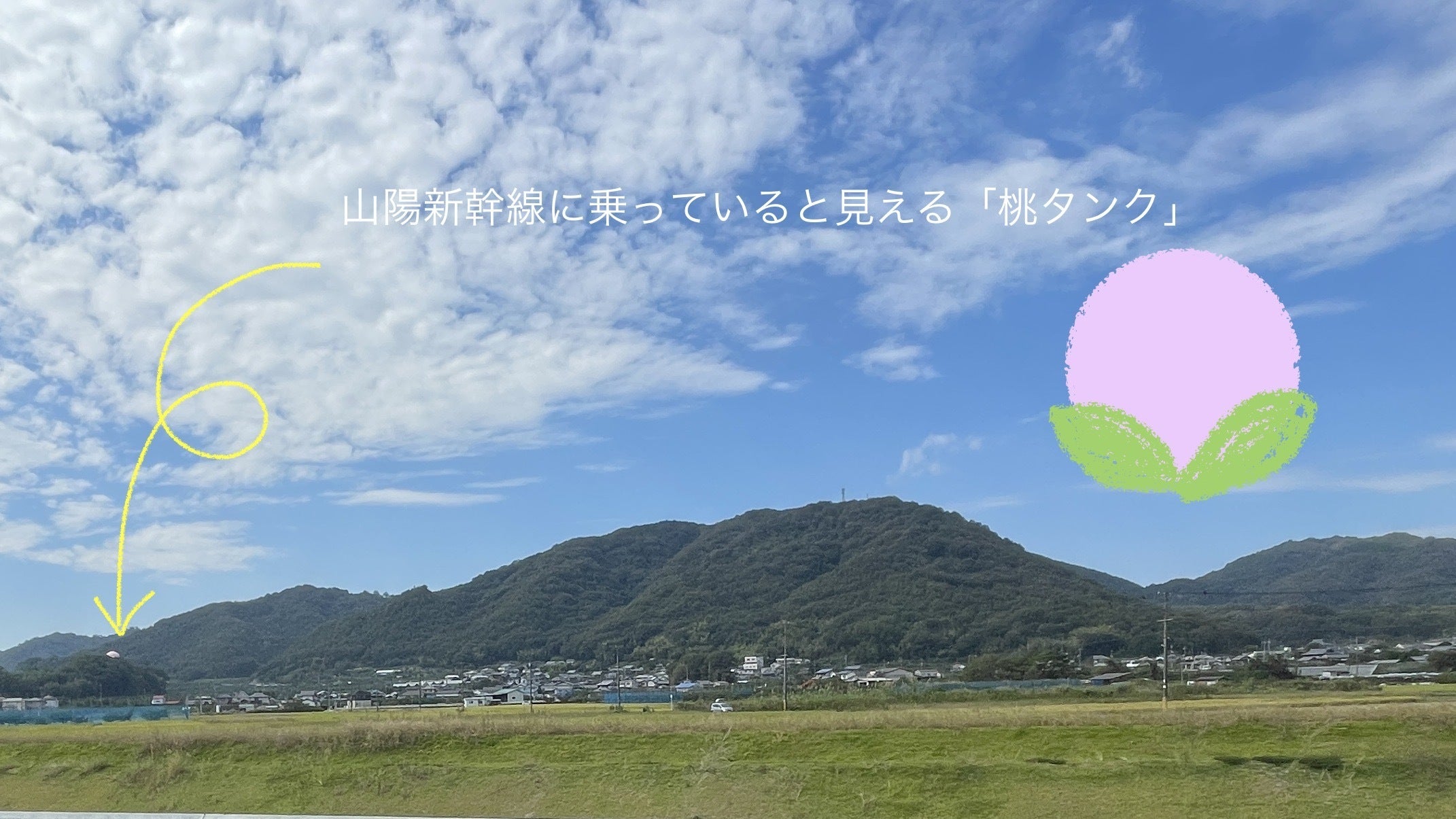 新大阪から博多へ向かう途中に新幹線から見える桃タンクのところ、が私たちの住む赤磐市です。