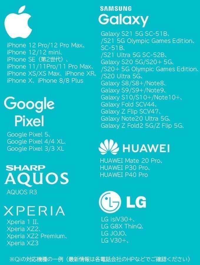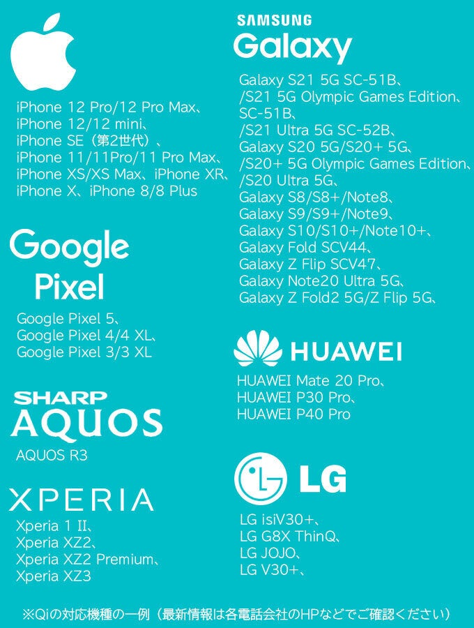 ※Qiの対応機種の一例(最新情報は各電話会社のHPなどでご確認ください)
