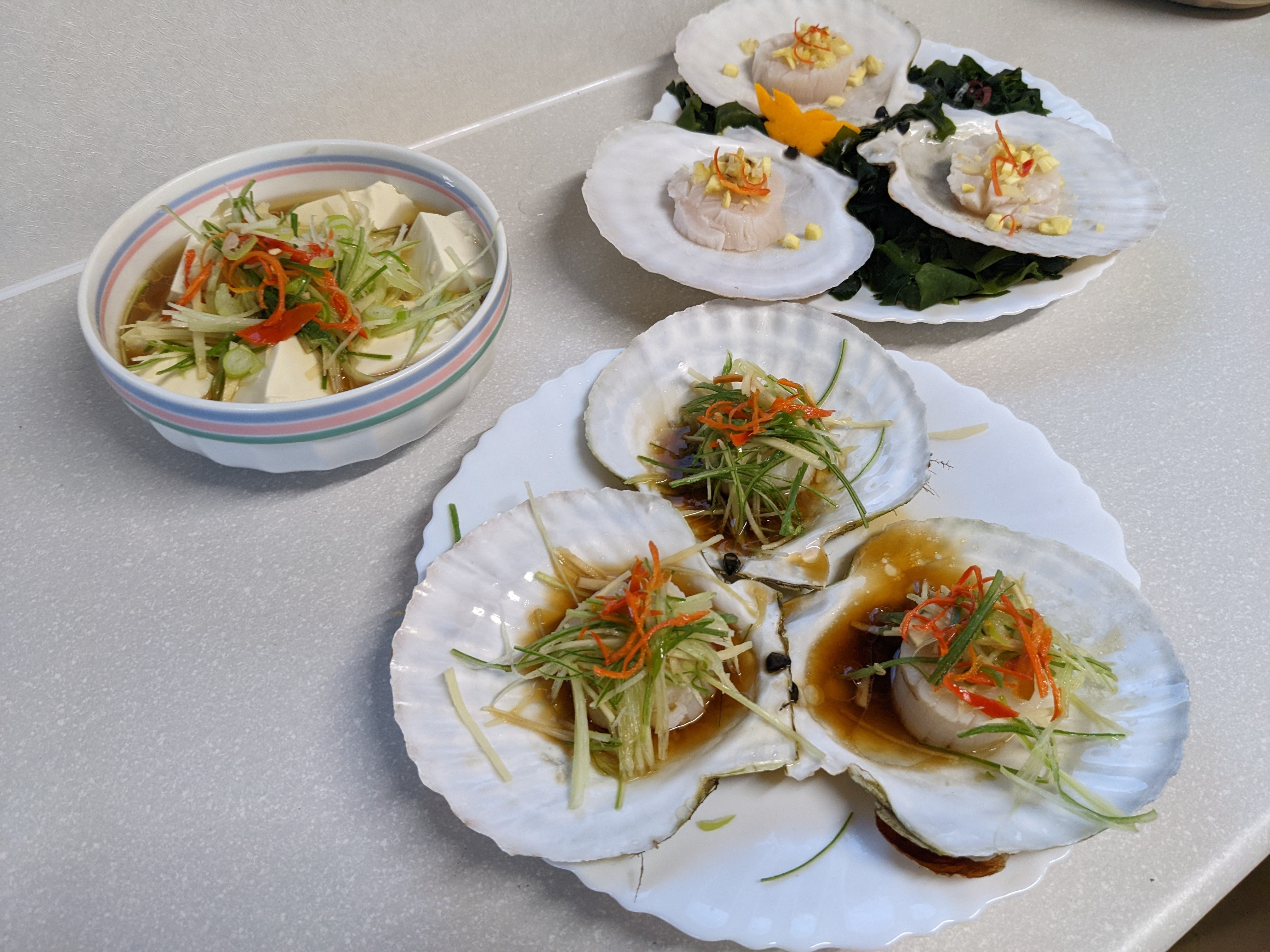 ホタテのレアサラダ(奥)、香り立つジューッと音なる香味野菜と活ホタテの油がけ(手前)、香港風香味野菜の湯豆腐