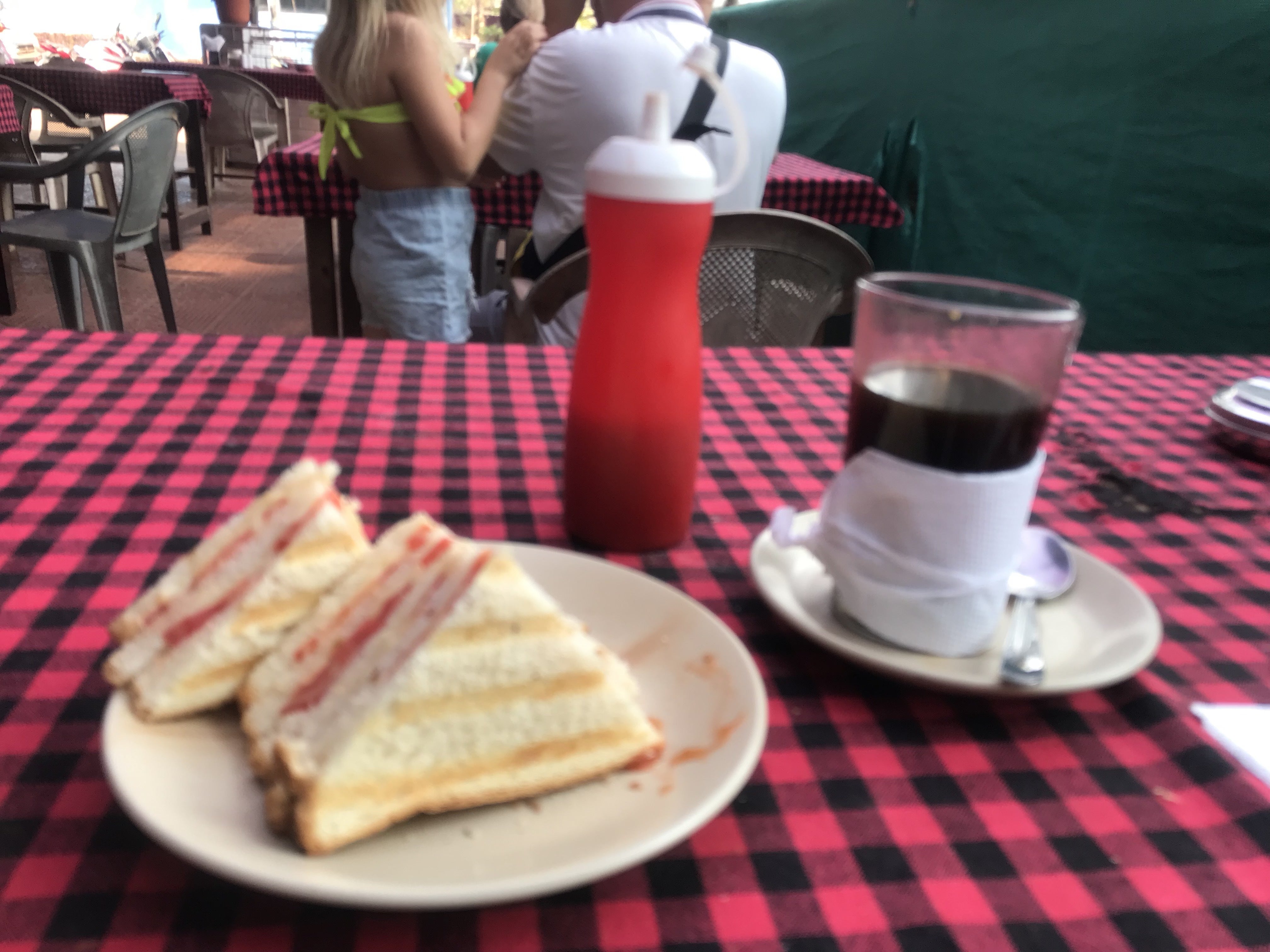 近場のカフェで、コーヒー40ルピー、サンドイッチ80ルピー、日本円で180円くらい。